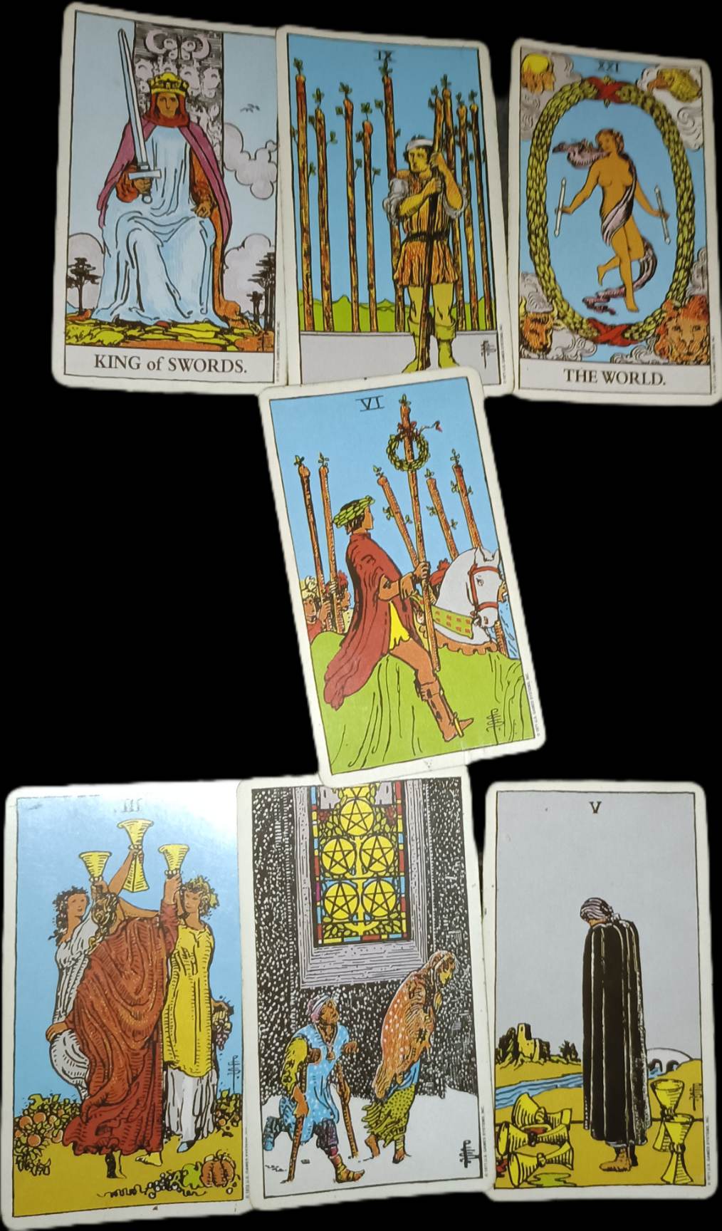 Ten rozkład od początku pokazuje twardą, bezkompromisową energię władzy. Nie ma tu subtelności, półśrodków ani miękkiego przywództwa. Pierwsze karty jasno stawiają archetyp Król Mieczy – władcy chłodnego, strategicznego, logicznego, który podejmuje decyzje bez oglądania się na emocje. To figura autorytetu, kontroli narracji i zarządzania konfliktem poprzez siłę umysłu.